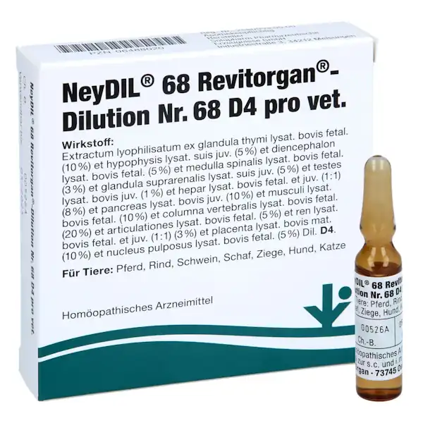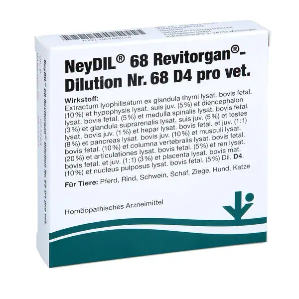 Neydil Nr.68 D4 pro vet. Klinikpackung Ampullen: „Thymus, Hypophysis, Diencephalon, Medulla spinal., Gland. suprarenal., Testes, Hepar, Pancreas, Musculi, Columna vertebral., Articuli, Ren, Placenta, Nucleus pulp. „