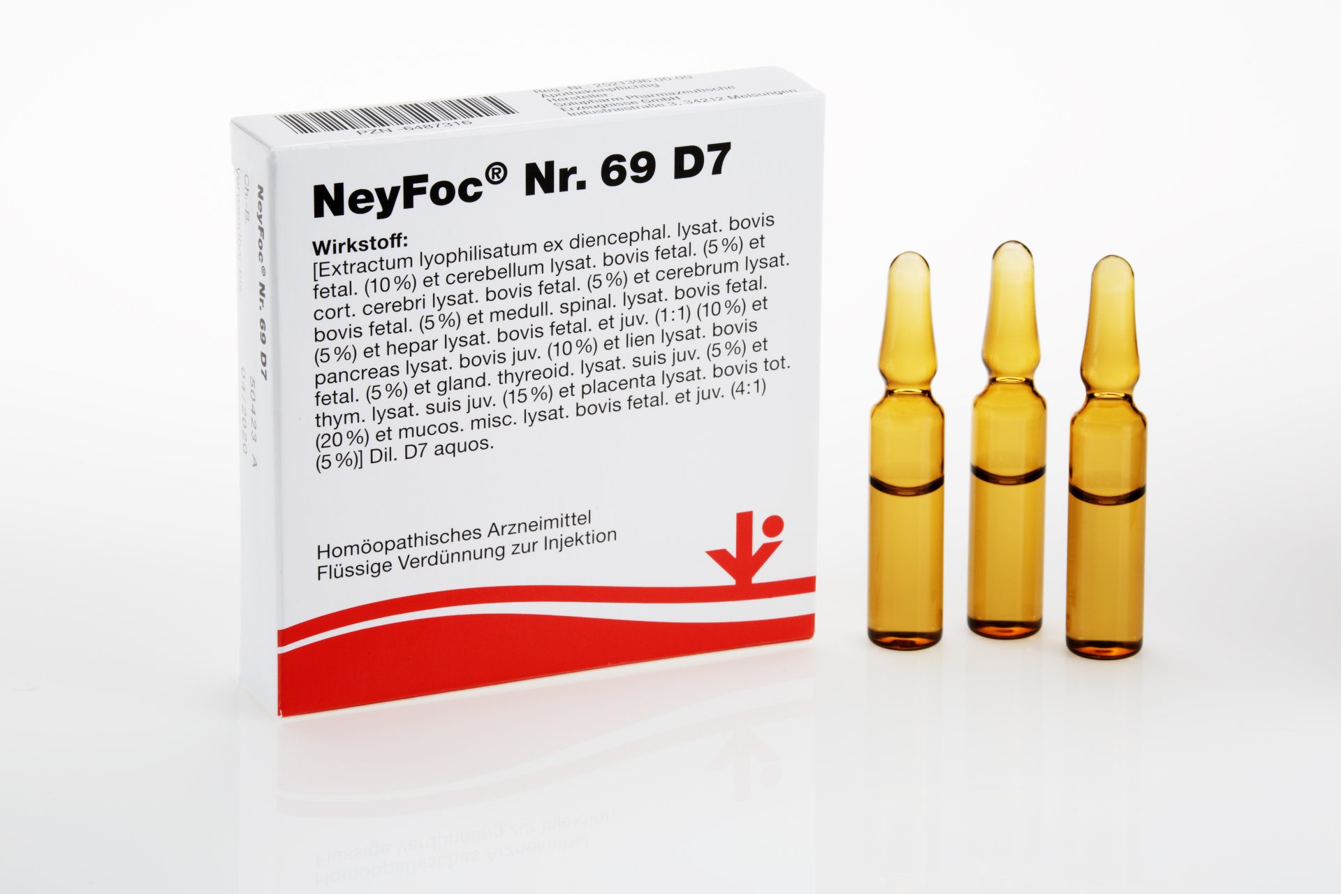 „Diencephalon, Cerebellum, Cortex cerebri., Medulla sinal., Hepar, Pancreas, Lien, Gland. thyreoidea, Thymus, Placenta, Mucosa misc.“ – Neyfoc Nr.69 D7 Ampullen.