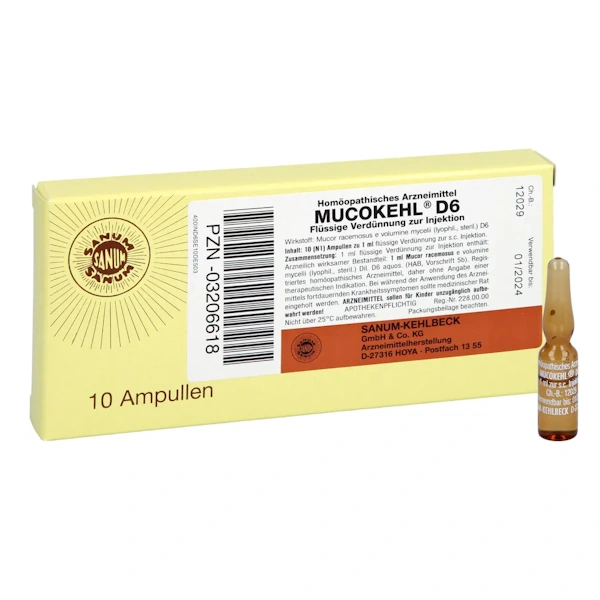 MUCOKEHL D6 ampoules is a homeopathic medicine and is made with the help of the mold Mucor racemosus. Within the framework of the elements of SANUM therapy, it is one of the drugs of the SYSTEM-REGULATION. A liquid dilution for injection in bacterial infections and inflammations.