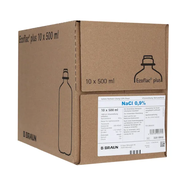 Saline solution 0.9% Ecoflac Plus from B.Braun – Full electrolyte solution for infusion and drug preparation.